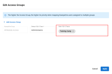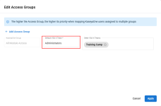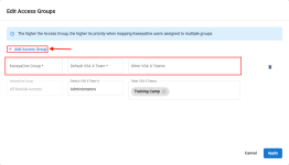 NOTE By default, the All Module Access KaseyaOne access group is selected for configuration. To configure additional KaseyaOne access group mappings, click + Add Access Group and choose which group you want to configure mapping rules for.