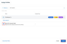 - In the pop-up that appears, check the box next to each profile that you want this policy extension to apply to the targeted devices. You can search keywords and/or filter by profile type at the top of the window. When done, click Assign to save your selections.