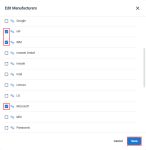 - In the pop-up that appears, check the box next to each manufacturer you want this extension to apply to, then click Save to apply your changes.