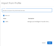 Click Import from Profile to select a Monitored Services type Monitoring profile and import one or more services from that profile to the profile you are configuring. Once a profile has been selected and the services are listed, select the check box next to any services you want to add.