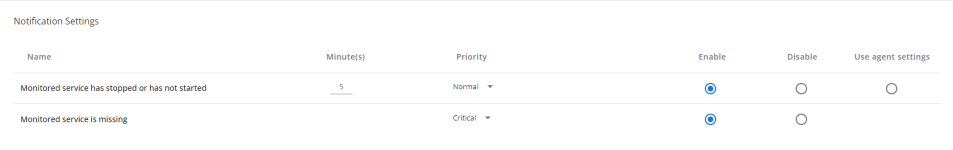 In Notification Settings, you can enable or disable notifications for if any monitored service in this profile has stopped or not started for a number of minutes you define, or if the service is missing altogether, as well as the notification priorities. For monitoring if a service has stopped or not started, you can also use agent settings. If deferring to agent settings, refer to Enabling Services monitoring.