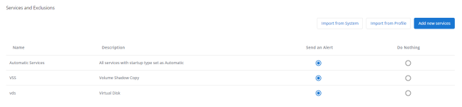In Services and Exclusions, you choose which services will send an alert by selecting Send an Alert. You can also exclude services in the profile from sending alerts by selecting Do Nothing.