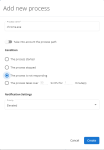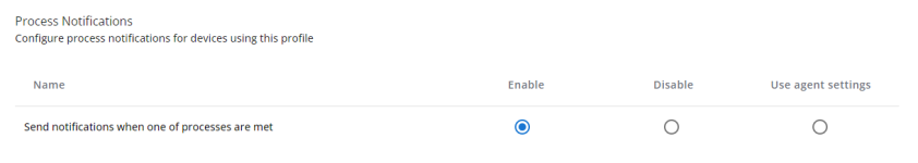 In Process Notifications, select if you want to enable or disable notifications when a process meets one of the conditions you define in Processes. You can also choose to defer to agent settings. If deferring to agent settings, refer to Enabling notifications for process or application monitoring.