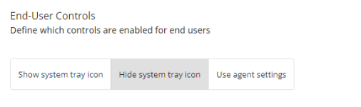 In End-User Controls, you can set whether the system tray icon is visible to end users, hidden, or defer to agent settings. Enabling this icon permits end users to request support from a system administrator. This setting can also be set at the agent level. Refer to Enabling User Support Request.