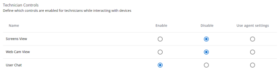 In Technician Controls, you can enable or disable Screens View, Web Cam View, and User Chat. You can also choose to defer to agent settings.