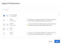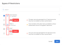 To learn how these users can configure their two-factor authentication settings, which would allow them to be granted permission to bypass IP restrictions, refer to Setting up and executing user-level 2FA. - Click Save in the window to add any selected teams and users to the list of those that are permitted to bypass IP restrictions.