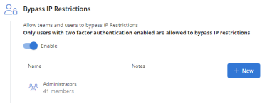 With the Enable toggle turned on in this section, you can specify teams and users who are permitted to bypass IP restrictions. To learn about IP restrictions, refer to the preceding section, Whitelisted IP Addresses.