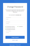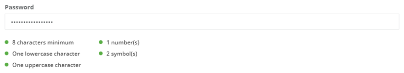 The configured password requirements are displayed when users create or change passwords. An entered password will not be accepted until all requirements are met.