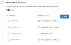 - Select or clear the Web Application and Rest Api check boxes to specify if the entered IP address/range should have access to the VSA 10 web application for the account, the VSA 10 API for the account, both, or neither.