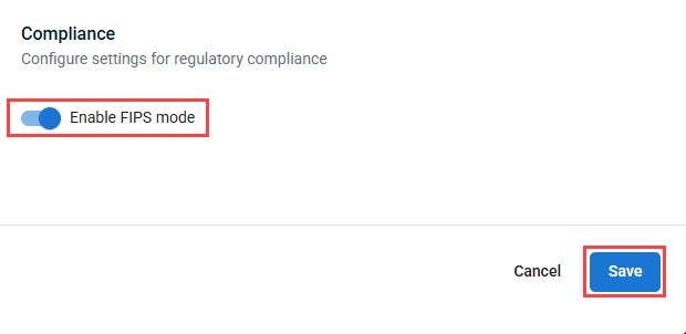 To turn on FIPS compliance, enable the Enable FIPS mode toggle, and click Save at the bottom of the page.