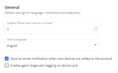 Send an email notification when new devices are added to the account | Select the check box for users who are configured to receive account email notifications to receive an email when new systems are registered to the account. Refer to Receiving account notifications. |