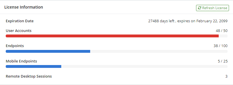 In the upper-right corner of the widget, click Refresh License to reload the widget with the latest values (for example, if a new user account was created or a new device was deployed).