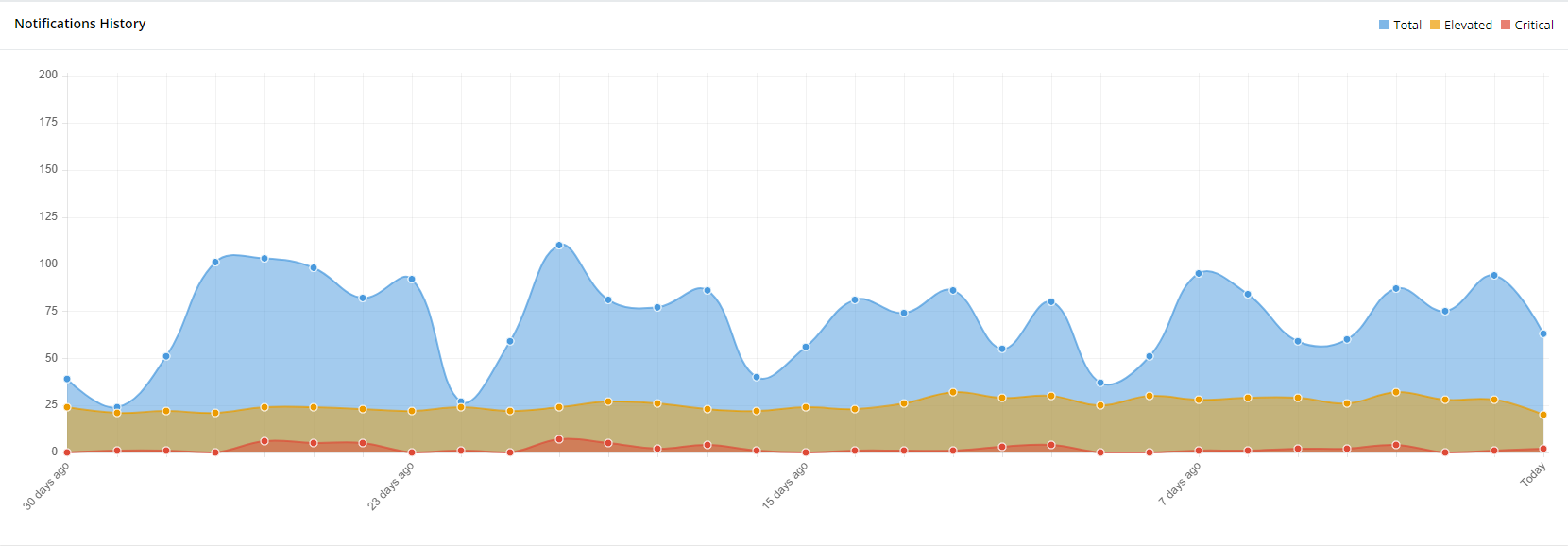The Notifications History graph displays alert metrics from the last 30 days, color-coded as follows:
