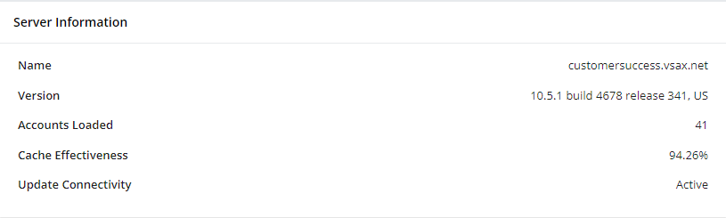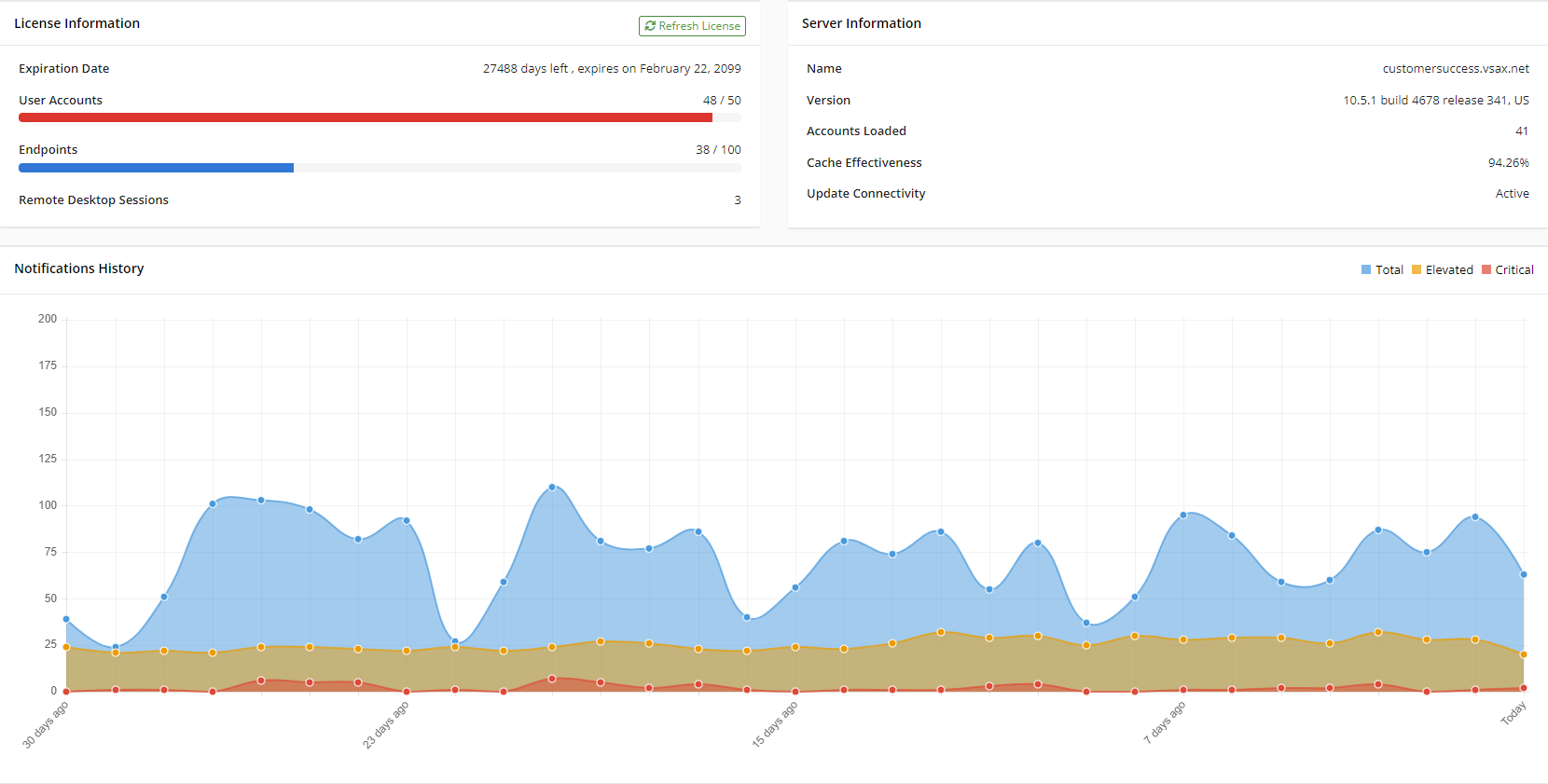 The server administration Overview page provides administrators an at-a-glance summary of key information about the VSA 10 account.