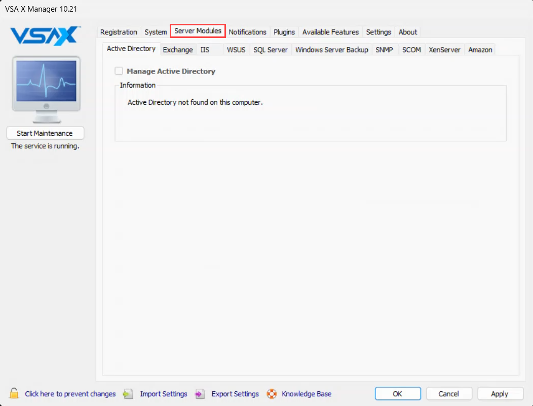 VSA X Manager Server Modules Settings
