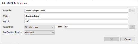 The SNMP tab contains a list of notification rules for monitored SNMP variables. To configure SNMP notifications, you must first add an SNMP agent and the variables you are interested in. Consult the MIB Document released by the device’s or software’s vendor to review accurate information of each variable’s purpose.