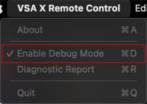 - On the source macOS machine, open the VSA X Remote Control app, and in the app menu, ensure Enable Debug Mode is checked.