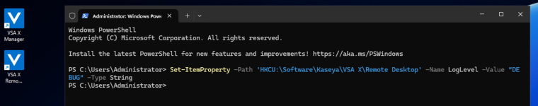 - Run this PowerShell command to enable the logging of the VSA X Remote Control desktop application: