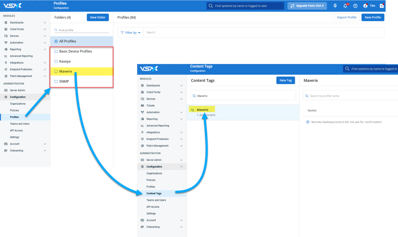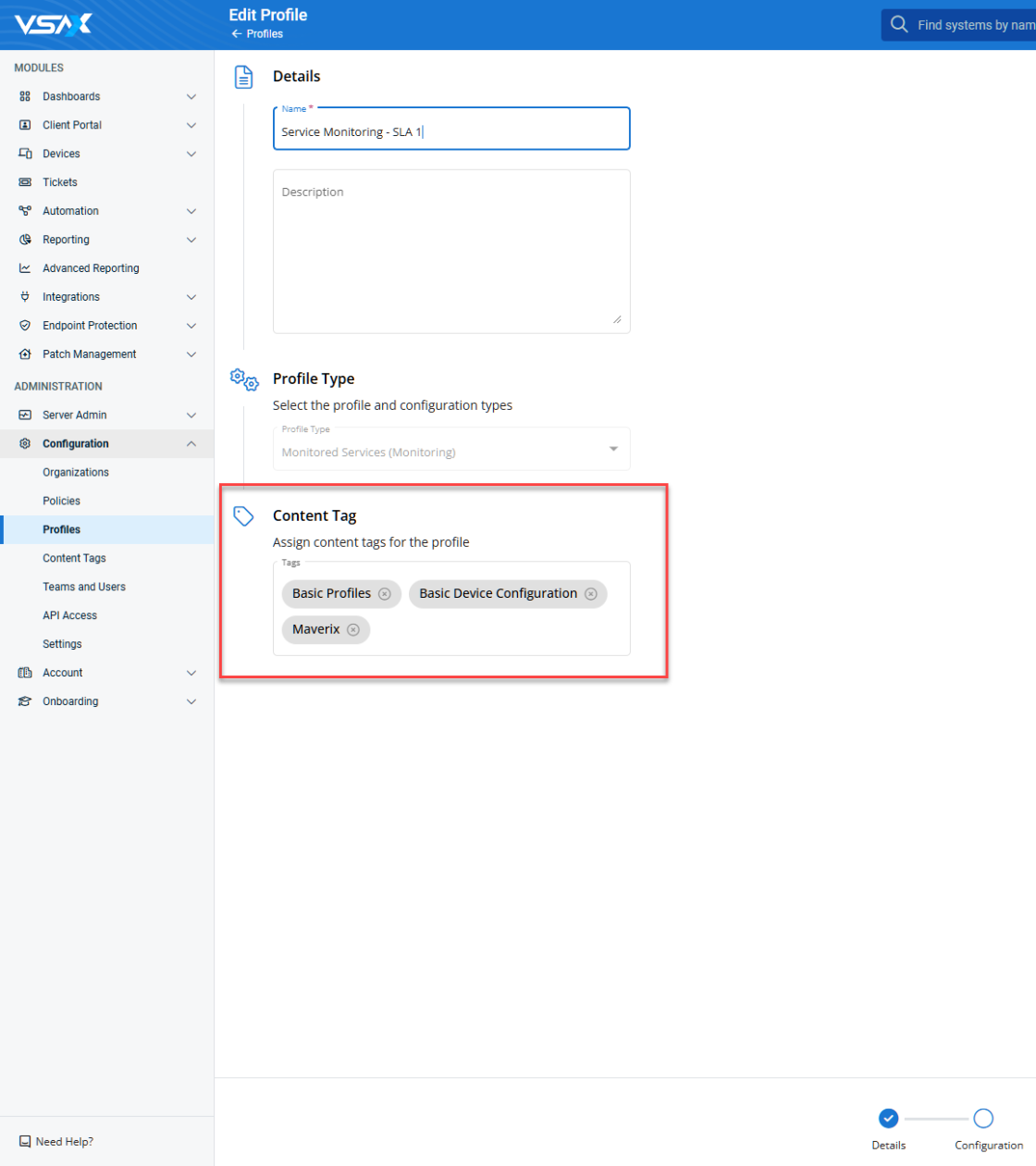 Several changes have been made to Configuration > Profiles to enhance the experience when organizing, filtering, and editing profiles, including the introduction of Configuration > Content Tags. A profile can be assigned to multiple content tags.