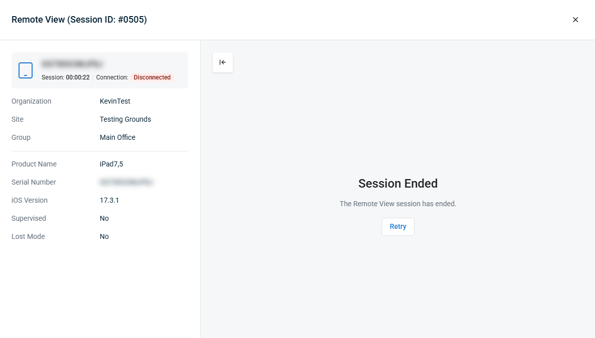 At this point, you can either close the Remote View window, or attempt reconnection by clicking the Retry button on the message to attempt to reconnect to the device.