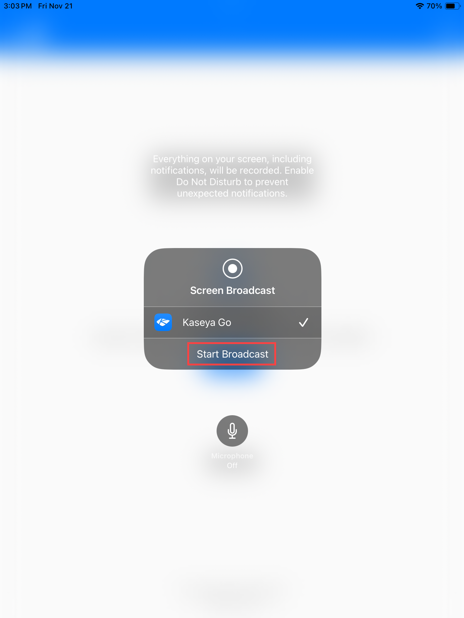 - On the remote iOS device, instruct the user to click the remote support request notification, or open the Kaseya Go app, and click Start Broadcast. The user can optionally enable microphone access at this point.