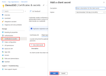 Under Manage > Certificates & secrets, click New client secret, enter a description and expiration date, then click Add.